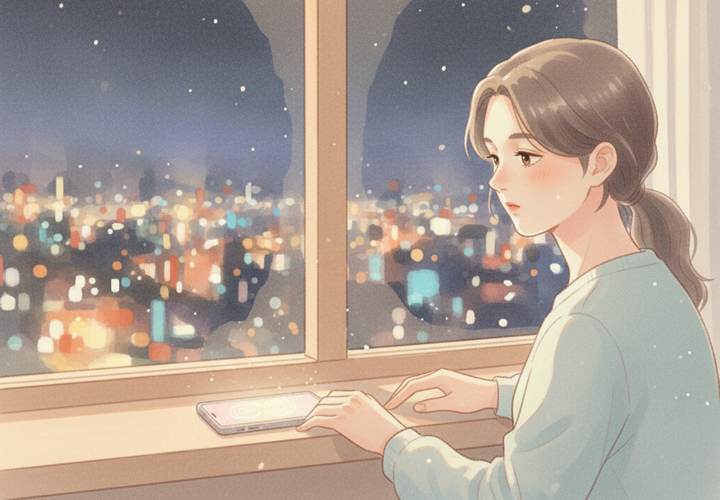 窓の外に広がる街の灯りを見ながら、