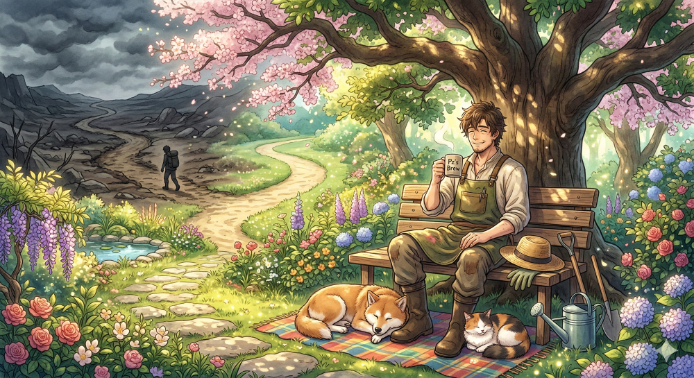 かつて庭師を「要領が悪い」と笑った旅人が、ボロボロの靴を履いて再び「Pzの庭」を訪れました。彼の背負った袋には、かつて大金で買った「魔法の粉」の空き瓶が詰まっていました。